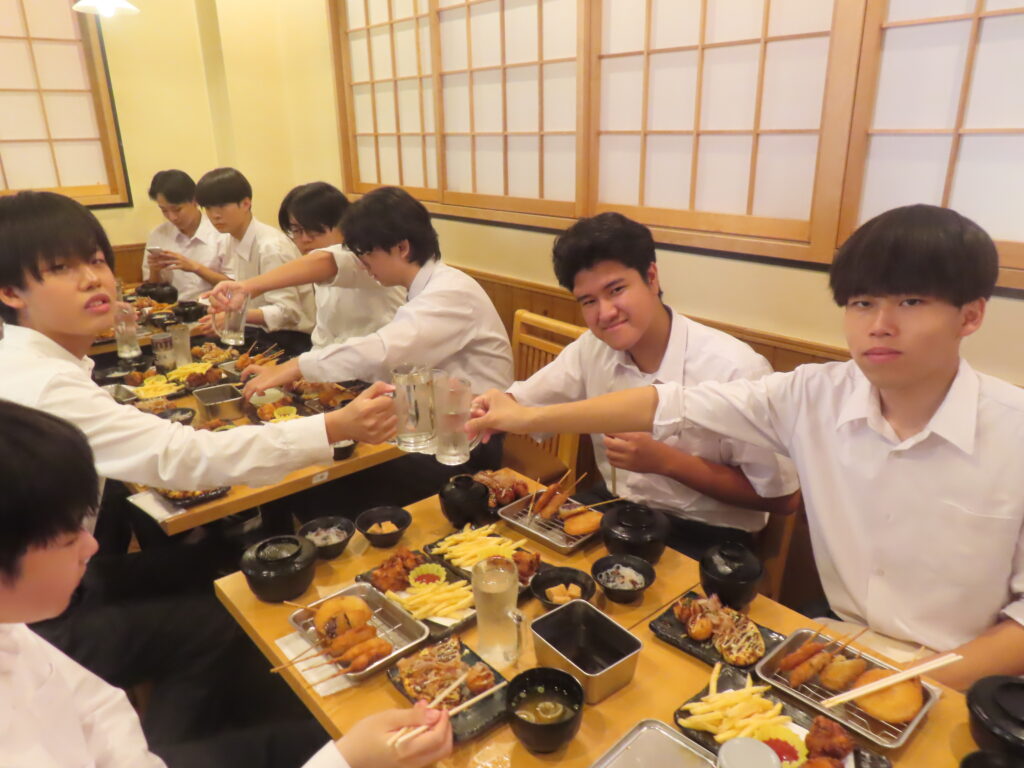 修学旅行3日目は、秋田クラークが乗車第一号というピカピカの新車バスで出発しました。バス会社の粋な計らいで、万博会場の前を通ってくださり、大屋根リング、入場を待つ大行列、風に舞う色とりどりの国旗など、万博の熱気と独特の雰囲気を味わいながら海遊館に到着。優雅に泳ぐジンベイザメなどを見学しました。お昼は、串カツ、お好み焼き、たこ焼きの大阪グルメを堪能した後、周辺を散策。あべのハルカスまで歩き、見学した生徒もいました。