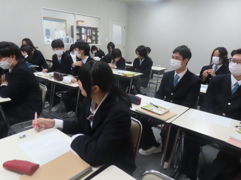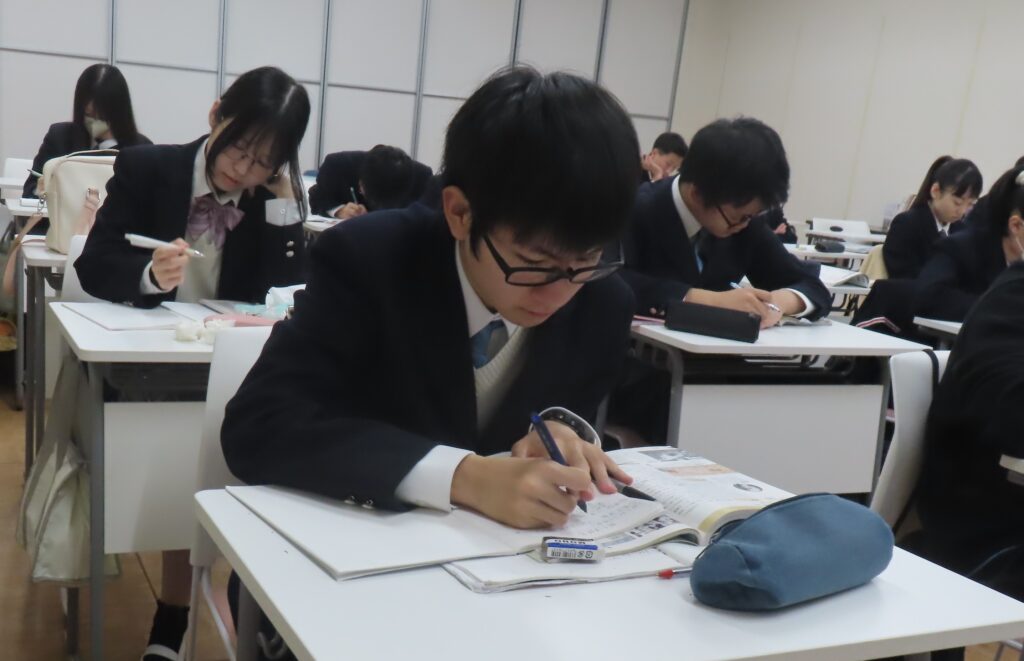 3年生日本史探究の授業では、大正時代の文化についての学習です。こちらは真剣な表情でノートをとる生徒が多いのが印象的でした。