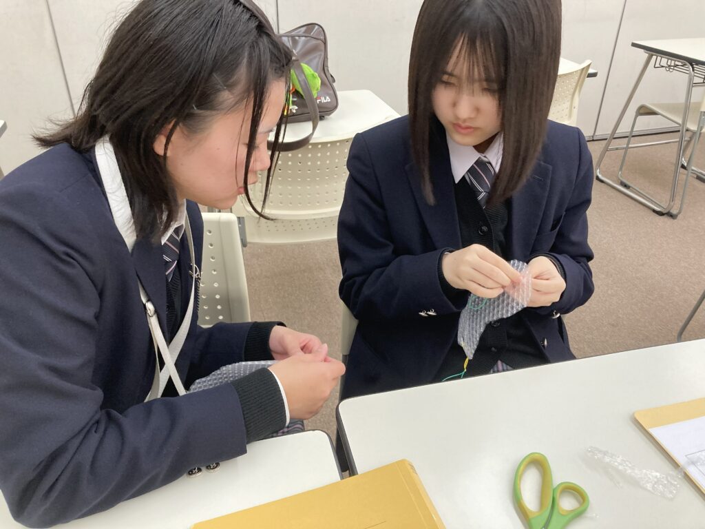 保育・福祉コースの2年生が、生活と福祉の時間に高齢者体験をしました。各自で作った難視メガネ、耳栓、軍手を装着。廊下の歩行や階段の昇り降り体験では、「足元が見えづらい」「階段は上るより、下る方が怖い」など不便さを感じたようでした。また、それらを装着したまま財布から小銭を出す体験では、ほぼ全員が「100円、50円、1円の硬貨の判別ができない」と間違えて財布から出し、見えづらさ、手の感覚が普段と違うことなどから同じような色の硬貨は判別が難しいことが分かりました。