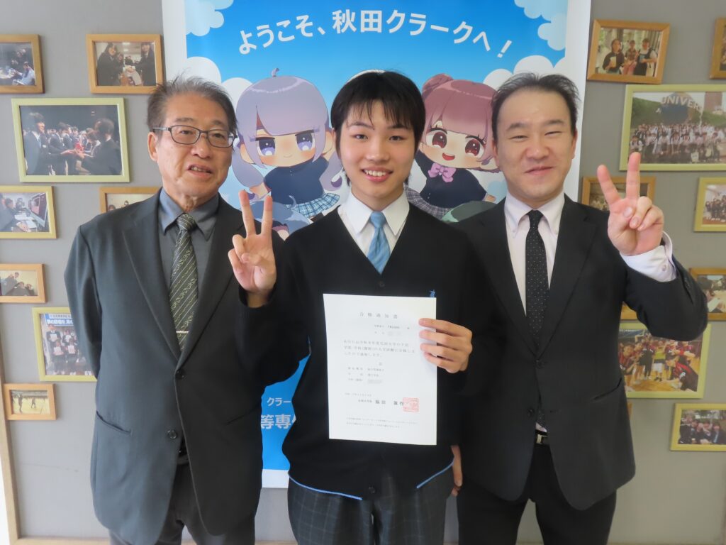 髙橋さんが「弘前大学 理工学部」に合格しました。1年次はITプログラミングコースで情報処理やプログラミングの基礎を学び、2年次からは関心の高い天文学を学べる大学への進学を目指して進学プログレスコースへ移りました。一般選抜でも合格できるよう英語・数学・理科を中心に入試対策を行いながら、総合型選抜も活用して受験機会を増やすことにしました。天文宇宙検定の取得、秋田県立大学での物理・数学講義の聴講、国立天文台の方によるブラックホール講座への参加などこれまでに自分自身で積み重ねた経験と、各科目の先生方との面接対策とを合わせて見事合格を勝ち取りました。天文学を探究したい、その熱意は誰にも負けないものがありました。その探究心をいつまでも。