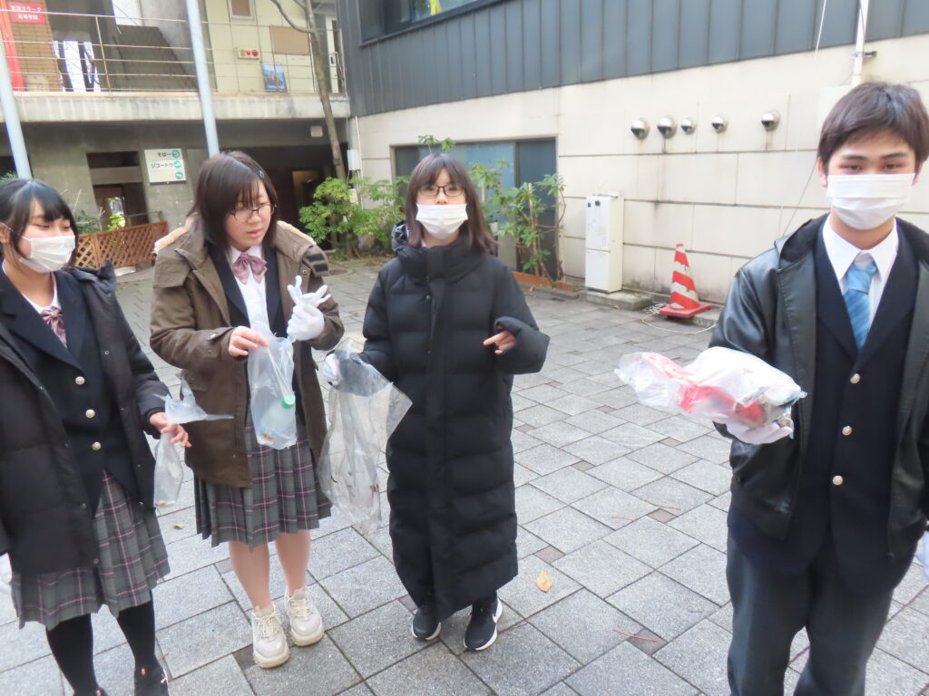 12月2日(火)1年生が体育Ⅰの時間にスポーツと環境について学習し、チームのメンバーと制限時間内にゴミを拾い、ゴミの量と質でポイントを競い合う「スポGOMI」を行いました。トングやごみ袋を持って元気に、大町、通町へゴミ拾いに出かけた生徒たち。大量の空き缶やたばこの吸い殻の他、ほうきや車のヘッドライトも落ちていたようです。生徒たちは、30分という短い時間でこんなにたくさんのゴミを拾うことができた達成感があったようですが、同時に、街にたくさんのゴミが落ちていることに驚いていました。