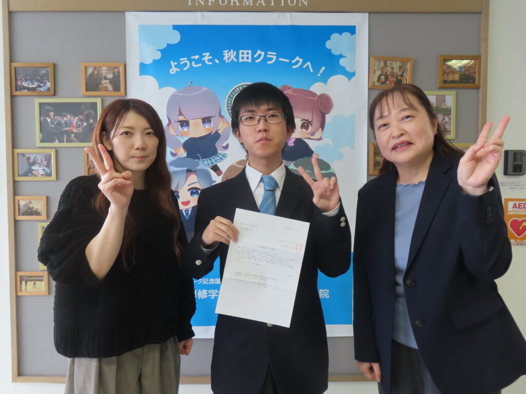 3年生の進路決定が続いています。今回は、就職内定について紹介します。江畑さんが株式会社サイゼリヤに、三浦さんが株式会社ウェルフェアに内定しました。江畑さんは、アルバイトの経験を活かして自分の適性を考え、本社まで見学に行くなど様々な経験と活動を通して進路を決めました。三浦さんは、面接の練習や検定の取得に早くから積極的に取り組みました。面接では自分の言葉でしっかりと答えられ、それまでの準備、練習の成果を出せたと笑顔で語ってくれました。また、船木さんが海上自衛隊一般曹候補生、陸上自衛隊一般曹候補生にみごと、合格しています。