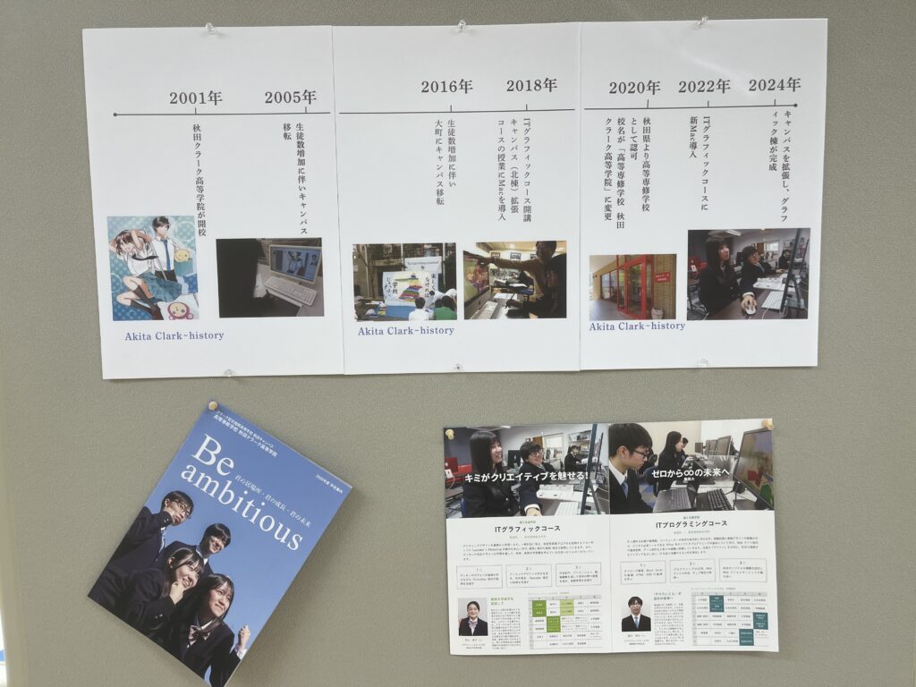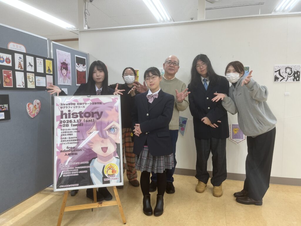 現在、フォンテAKITA6階のあきた文化交流発信センターで、ITグラフィックコースの生徒による作品展示イベントが開催中です。今年のテーマ「history」に沿って生徒それぞれが思い思いにイメージを膨らませ、作品を制作しました。生徒からは「背景やキャラクターをテーマに近づけるのは難しかった反面、楽しかった」などと感想がありました。