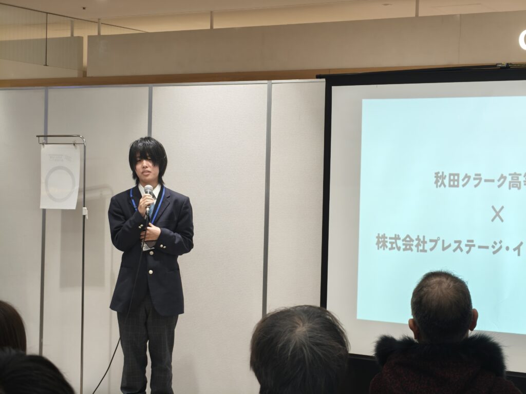 1月24日(土)、「高校生×企業魅力発見フェス」が秋田オーパで開催されました。このイベントは、高校生が地元企業の魅力を取材し、PR動画にまとめて発表する取り組みです。秋田クラークからは、ITプログラミングコースの4人がプロジェクトに参加。12月からプレステージ・インターナショナルへ実際に足を運び、撮影や社員の方への取材を重ねてきました。プロの仕事現場を自分たちの目で確かめ、学んできたスキルを活かして試行錯誤を繰り返す中で、納得のいく力作を作り上げました。会場のスクリーンで動画が上映されると、その完成度の高さに多くの人が足を止めて見入っていました。