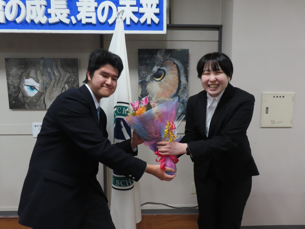 式の中では、生徒会長の漣さんから「2年生は更に挑戦し続けよう、1年生は高校生だからこそできることをやっていこう」と呼びかけがありました。生徒代表の作文発表では「この1年を振り返り、自分の不安な気持ちを乗り越えられた」という成長の言葉が語られました。それぞれが1年間やり終えた達成感に喜び、進級したらやりたいこと、挑戦することなど新たな目標を定めていました。